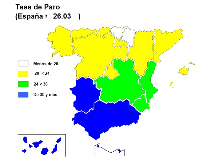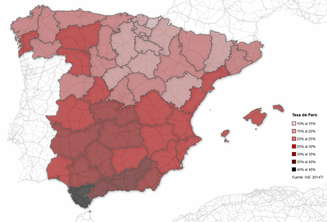 El siguiente mapa resume la dramática situación del desempleo en España.