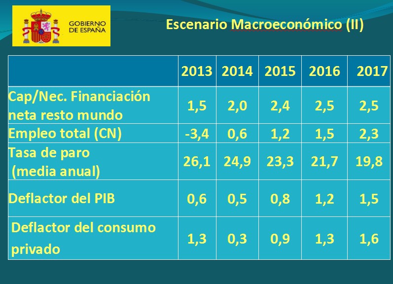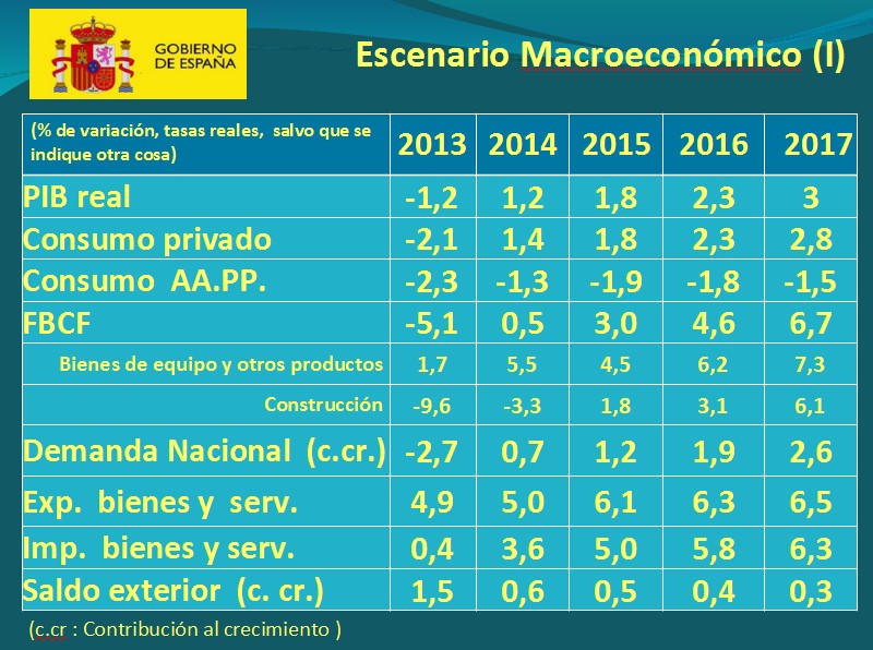 El ministro de Economía, Luis de Guindos, se ha encargado de presentar hipótesis "muy prudentes" del cuadro macroeconómico. De Guindos ha avanzado que este año la economía española crecerá un 1,2%, casi el doble del 0,7% previsto por el Gobierno. El incremento del PIB en 2015 será del 1,8%, seis décimas por encima del 1,2% programado. Para 2016, las estimaciones van del 1,7% al 2,3% en 2016 y del 3% en 2017.