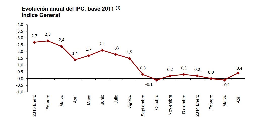 Con el dato del cuarto mes del año, ya son ocho los meses en los que el IPC interanual se mueve en tasas muy bajas, de apenas unas décimas. El último mes en el que los precios registraron una tasa más habitual para la economía española fue el de agosto, cuando el IPC se situó en el 1,5%. A partir de ahí, en parte por el 'efecto escalón' de la subida del IVA' aplicada en 2012, el IPC dio un importante bajón.