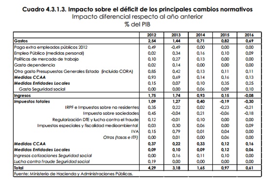 Así, el cuadro de la página 42 del mentado documento contiene el desglose recaudatorio de las principales modificaciones tributarias practicadas desde 2012 y previstas hasta 2016. En él, efectivamente, se contempla una merma de recaudación por IRPF y Sociedades de 0,68 puntos del PIB entre 2015 y 2016: aproximadamente, los 7.600 millones de euros prometidos por Montoro.