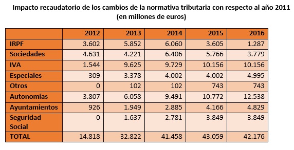Todavía peor: el cuadro anterior sólo refleja los efectos recaudatorios de las reformas fiscales sobre el año en el que son aprobadas. Eso no significa que sus efectos queden circunscritos a ese año, sino simplemente que el cuadro no los presenta de manera acumulativa. Por ejemplo, en el año 2012 el Gobierno modificó el IRPF con unos efectos recaudatorios estimados de 0,35 puntos del PIB; a su vez, en el año 2013 el Gobierno volvió a modificar el IPRF para recaudar, esta vez, 0,22 puntos del PIB adicionales: pero esos 0,22 puntos no eran sustitutivos de los 0,35 de 2012, sino aditivos, es decir, a finales de 2013 el IRPF recaudaba 0,57 puntos sobre el PIB más que a comienzos del 2012 como consecuencia de los rejonazos tributarios practicados por Montoro.