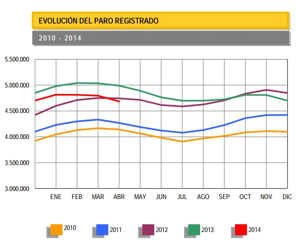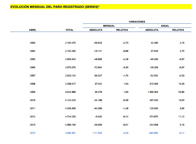 Si lo comparamos con abril de 2013, el paro se redujo en 304.892 personas, el único descenso interanual del paro desde 2007 y el mayor de la serie histórica. En abril de 2009 fue cuando el paro interanual alcanzó su cifra más alarmante, con 1.306.363 millones de parados más que en abril de 2008.