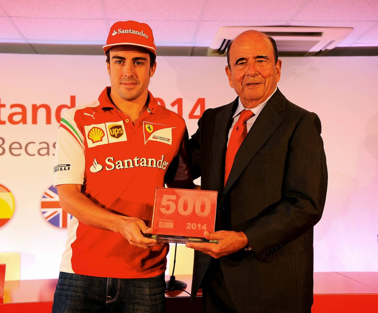 Botín entregó a Fernando Alonso un trofeo conmemorativo de las 500 becas que ya se han repartido entre universitarios españoles. Este año se han cumplido cinco años de este programa de becas, lanzado en 2010.