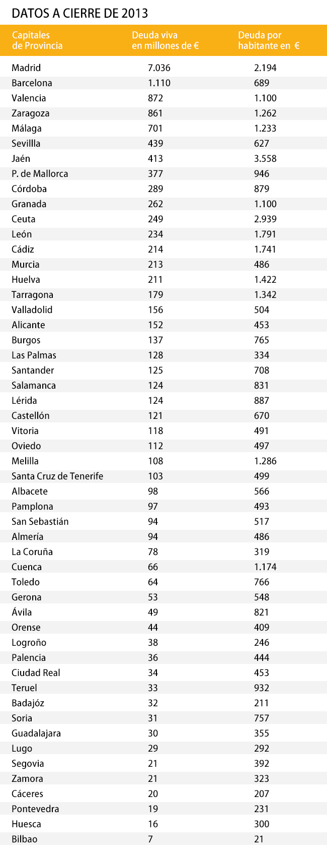 A Madrid le siguen, de lejos, otras cuatro grandes ciudades. Barcelona es la segunda capital de provincia más endeudada, con 1.110 millones de euros; seguida de Valencia, con 872 millones; Zaragoza, con 861 millones y Málaga con 701 millones. Bilbao se sitúa en el lado contrario de la tabla, con una deuda que apenas supera los 7 millones de euros. Huesca (16 millones), Pontevedra (19 millones), Cáceres (20 millones) y Zamora (21 millones), están detrás de la capital vasca.
