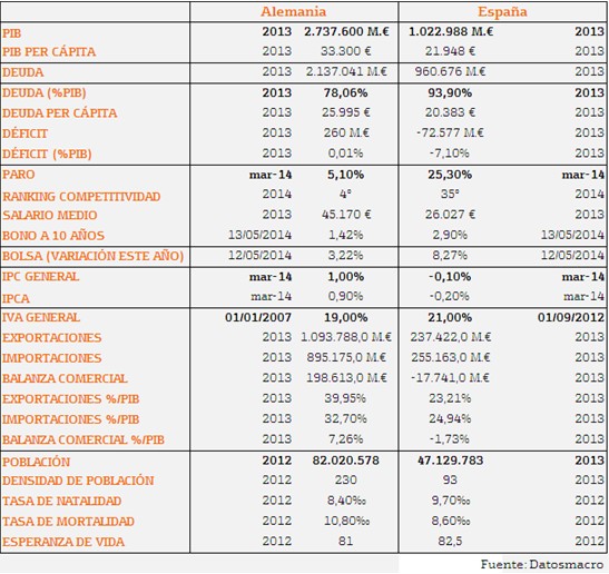 El siguiente cuadro compara las dos economías, tal y como recoge el blog de Bankinter. Poniendo en relación unos datos con otros podemos sacar bastantes conclusiones. Por ejemplo, lo que correspondería de deuda pública a cada ciudadano en Alemania es 25.995 euros y en España 20.383 euros. La conclusión obvia es que cada español debe menos en concepto de deuda pública que cada alemán, lo que no deja de ser una buena noticia.