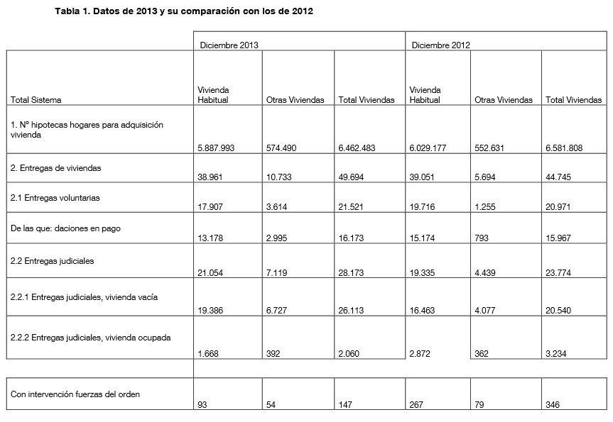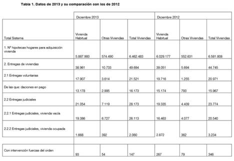 - Entregas forzosas: 7.119 ejecuciones hipotecarias con intermediación judicial, lo que supone un aumento del 62% respecto a 2012. Tan sólo en 392 casos el desalojo se produjo con la vivienda ocupada y en 54 tuvo que intervenir la policía.