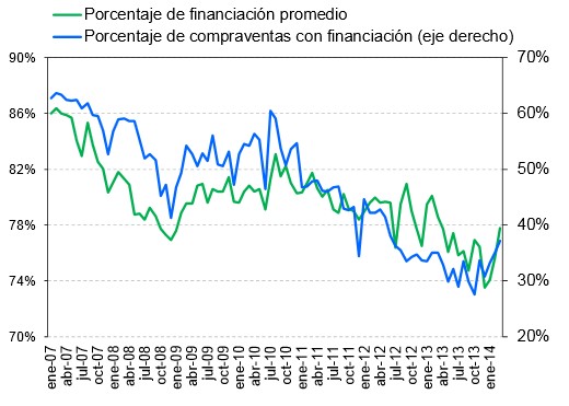 Pese a ello, el número de transacciones financiadas mediante crédito hipotecario repuntó hasta situarse en el 37,2% del total de operaciones registradas en marzo. Por último, la cuantía del préstamo alcanzó de media el 76,7% del precio de la vivienda, "algo más que en los últimos meses, aunque todavía un 2,7% por debajo del registrado en el mismo mes del año anterior".