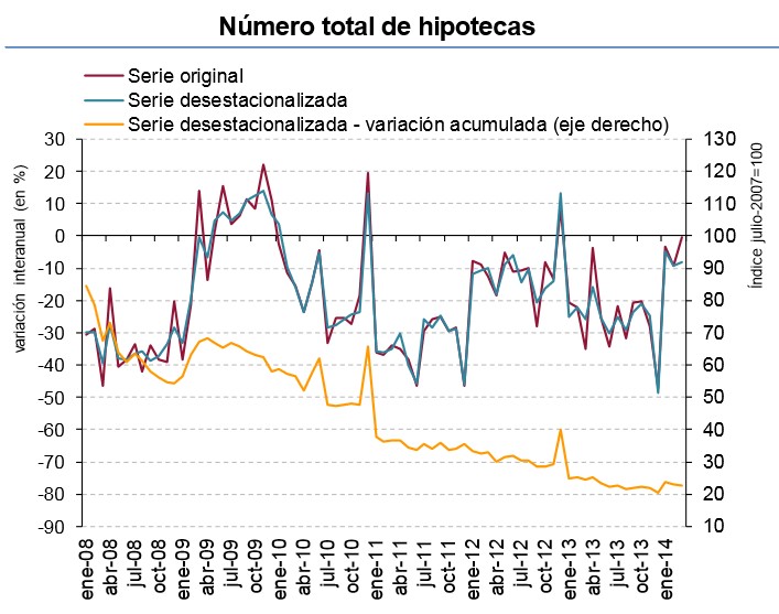 Con datos de marzo, el número de hipotecas para compra de vivienda ascendió a 11.265, un 46,3% más que un año antes, con una cuantía promedio de 116.673 euros por crédito (+8,8%).