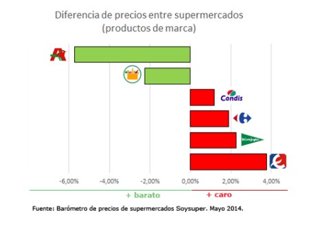 En el lado contrario, como el supermercado más caro, se sitúa Eroski. Los productos de la cadena vasca son un 3,8% más costosos que sus competidores. A Eroski le siguen El Corte Ingles, Carrefour y Condis.