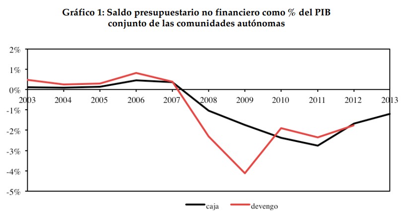 Por un lado, el informe refleja la evolución del déficit autonómico desde 2003, empleando tanto el criterio de devengo como el de caja (ingresos y gastos se imputan en el momento en que realmente se desembolsan). Tal y como muestra el siguiente gráfico, las autonomías mantienen en promedio ligeros superávits hasta alcanzar un máximo en el año 2006. Sin embargo, con la llegada de la crisis, los saldos presupuestarios "se deterioran muy rápidamente".