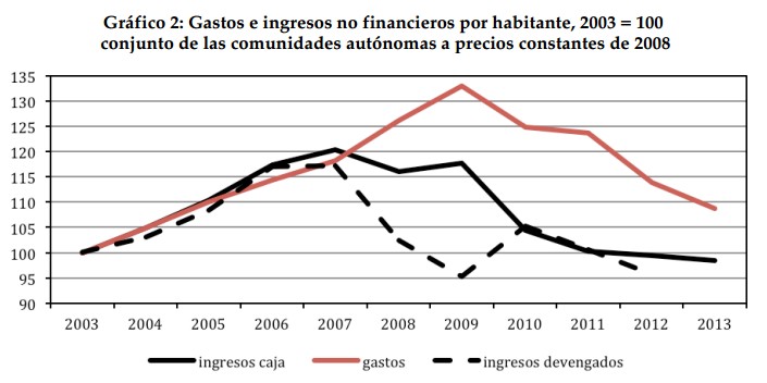 En concreto, entre 2003 y 2007, los ingresos autonómicos por habitante se dispararon en más de 20 puntos porcentuales, pero tras el estallido de la crisis la recaudación se hundió casi hasta su punto de origen, situándose en 2013 un 1,6% por debajo del nivel registrado en 2003. Asimismo, el gasto real creció 33 puntos entre 2003 y 2009, pero desde entonces se ha reducido en 24 puntos, hasta un nivel similar al observado en 2005 y 9 puntos por encima del de 2003.