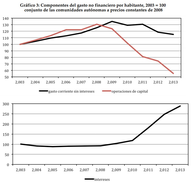 Como se aprecia en el siguiente gráfico,la inversión pública se reduce de forma rápida e intensa desde el estallido de la crisis, hasta situarse a casi la mitad del nivel registrado en 2003; el gasto en intereses se triplica en pocos años como resultado de la rápida acumulación de deuda y de la subida de la prima de riesgo; mientras que el grueso del gasto corriente registra a partir de 2009 una caída mucho más modesta que el gasto total, manteniéndose en 2013 a niveles de 2006-07.