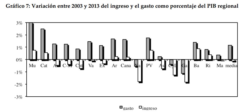 De la Fuente ha depurado los ingresos y gastos no financieros de las CCAA desde 2003, excluyendo las partidas en las que actúan como intermediarias (transferencias del Estado a las corporaciones locales y subvenciones europeas de la PAC) para comparar su evolución de forma homogénea, arrojando los siguientes resultados.