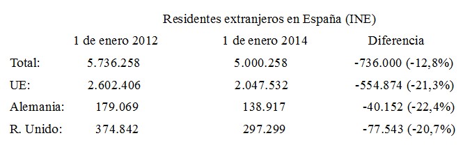 La población extranjera comenzó a descender en 2011 y, desde entonces, España ha perdido algo más de 750.000 residentes foráneos, sobre todo en los dos últimos años. El número de extranjeros a fecha 1 de enero de 2014 apenas superaba los 5 millones de personas, 736.000 menos que a 1 de enero de 2012, lo que supone una caída del 12,8%, según refleja el padrón continuo del Instituto Nacional de Estadística (INE).
