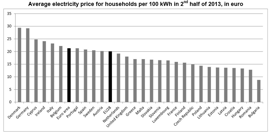 El precio de la luz en España se situó por debajo de la media de la zona euro en el segundo semestre de 2013. En concreto, los hogares pagaron 20,8 euros en sus recibos por cada 100 kilovatios hora (kWh), lo que supone un 2,3% menos que la eurozona (21,3 euros), pero un 4% más que la media de la UE-28 (20 euros), según anunció el miércoles la oficina estadísica comunitaria, Eurostat.