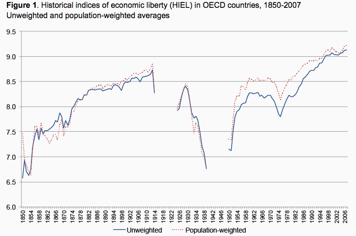 A primera vista podemos ver que la segunda mitad del siglo XIX fue un periodo de continuo progreso en materia de liberalización económica, ya que la puntuación de los países de la OCDE saltó del 6,5 al 8,5 en apenas medio siglo. La tendencia se invirtió con el estallido de la I Guerra Mundial y con las medidas económicas adoptadas en el periodo de entreguerras.