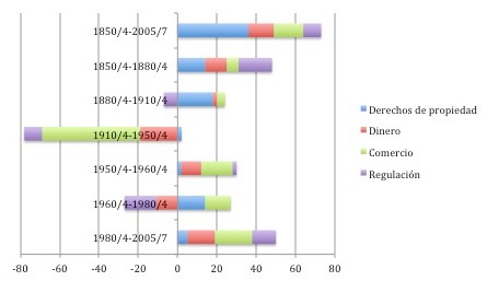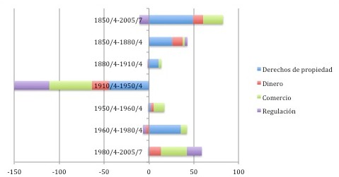 Considerando todo el periodo (1850-2007), el principal factor de progreso fue la mejora de los marcos institucionales, con la protección de la propiedad privada como eje central.