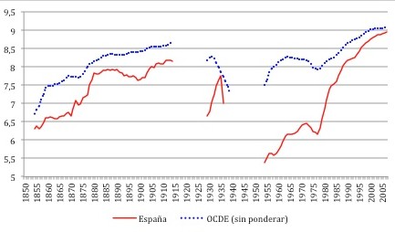 A la luz de la gráfica, resulta evidente que España ha experimentado un gran avance a lo largo de la segunda mitad del siglo XX. Si en 1950 la puntuación de nuestro país era de 5,5 frente al 7,5 de la OCDE, en 2007 ambas líneas convergen en el entorno de los 9 puntos.