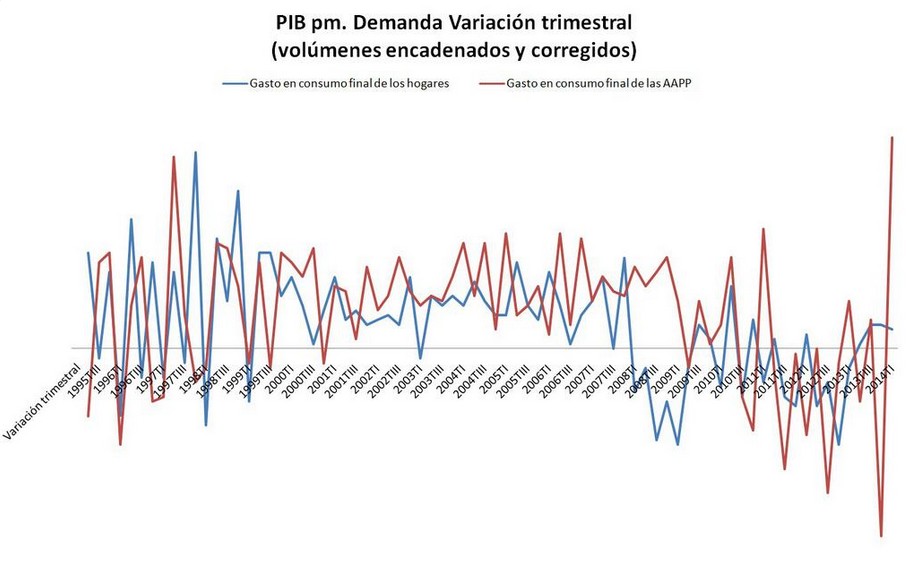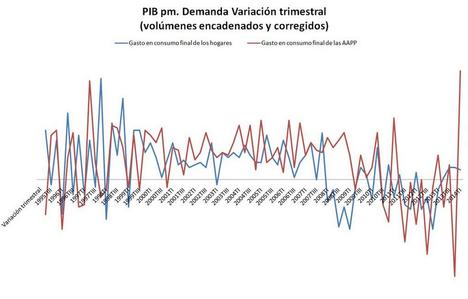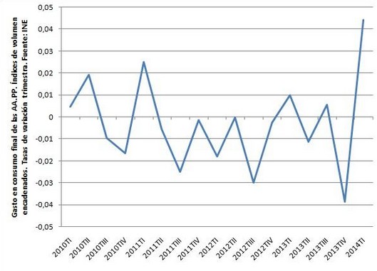 El consumo público ha pasado de caer un 3,9% en el cuarto trimestre de 2013 (el mayor descenso trimestral de toda la serie) a aumentar un 4,4% en el primero de 2014. Asimismo, a nivel interanual, el gasto público pasa de bajar un 3,7% a subir un 0,1% entre el pasado enero y marzo, respectivamente. Tanto el descenso de finales del pasado año como el inédito incremento del primer trimestre constituyen anomalías muy significativas a la vista del análisis histórico de los datos.