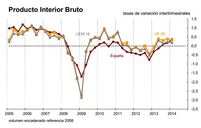 La economía española creció un 0,4% entre enero y marzo, duplicando así el ritmo de avance registrado en el cuarto trimestre de 2013 (+0,2%), según las cifras publicadas este jueves por el Instituto Nacional de Estadística (INE). Asimismo, el PIB aumentó un 0,5% a nivel interanual, su primera tasa positiva tras acumular diez trimestres de contracción, frente al -0,2% del trimestre precedente.