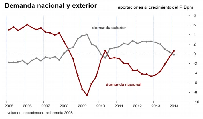 Hasta aquí los grandes números. Pero la clave radica en la composición de dicho crecimiento. Y es que, a diferencia de lo que venía sucediendo en los últimos años, el PIB sube gracias al empuje de la demanda interna, mientras que, por el contrario, el sector exterior, lejos de aportar, resta crecimiento a la economía por primera vez en cuatro años.