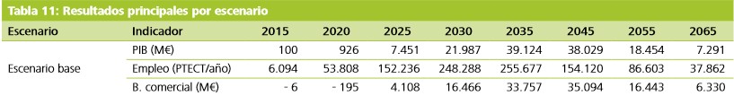 Así, en ausencia de impedimentos administrativos y regulatorios, este sector supondría una "aportación al PIB superior al 1% del nivel actual durante un periodo superior a 30 años" en el escenario base. Entre 2014 y 2065, el valor añadido bruto que acumularía dicha actividad superaría el billón de euros. Y, en concreto, generaría más de 40.000 millones al año entre 2036 y 2044, el período de máximo impacto, equivalente a más del 4% del PIB actual, superando en importancia a otras actividades como el transporte o el sector primario.