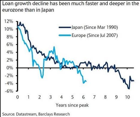 El miedo de la institución es que la zona euro sufra una contracción crediticia similar a la registrada por Japón durante su crisis en los años 90, tras el estallido de su particular burbuja inmobiliaria. Éste era, y sigue siendo, el indicador clave al que se agarra el BCE para aprobar nuevos estímulos monetarios.