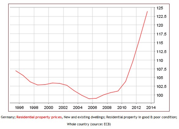 Pero es que, además, esta laxa política monetaria puede acabar generando burbujas en los países más sólidos de la zona euro. Los bajos tipos de interés incentivan la expansión del crédito en las economías del norte. En Alemania, por ejemplo, el precio de la vivienda ha subido de forma muy sustancial en los últimos años.