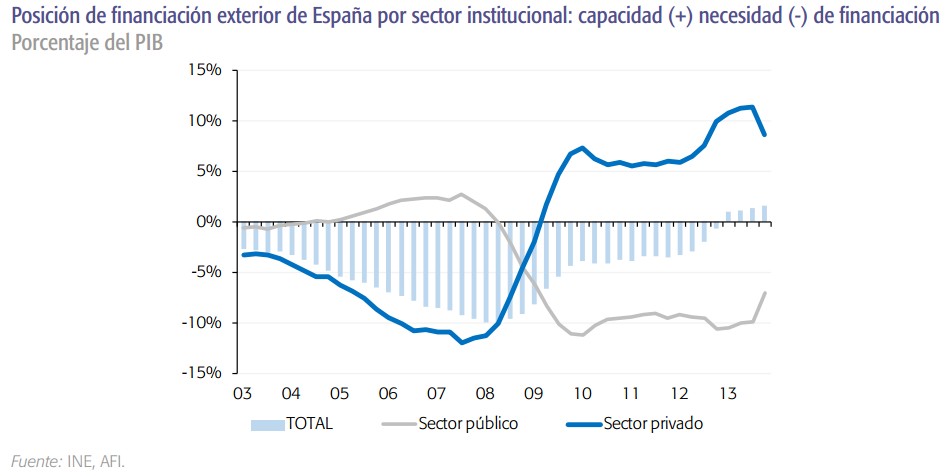 Es decir, el sector privado de está desapalancando, lo cual, lejos de ser negativo, es esencial para volver a crecer sobre bases sólidas. Prueba de ello es el superávit exterior que presenta hoy la economía española -un auténtico brote verde-. Y ello, a pesar de que el sector público sigue gastando mucho más de lo que ingresa (déficit), con el consiguiente incremento de la deuda, cuyo nivel avanza hacia el 100% del PIB.