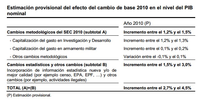 Hasta ahora, la Contabilidad Nacional de España se calculaba con base al año 2008, pero tras la modificación se tomará como base 2010. El cambio entre estas dos bases elevará la riqueza de nuestro país entre un 2,7% y un 4,5%. Así, si tenemos en cuenta que el PIB nominal de 2010 fue de 1.062.591 millones de euros, el impacto de la variación podría ser de entre 28.689 y 47.800 millones, según los cálculos provisionales del INE enviados a Eurostat.