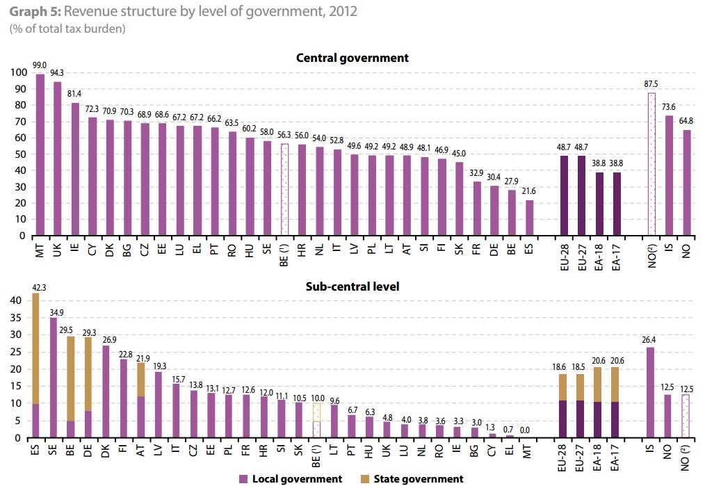Lo primero que llama la atención es la estructura impositiva por nivel de Gobierno. De los 28 países de la UE, ninguno entrega un porcentaje mayor de sus ingresos tributarios a sus regiones. En España, en 2012, el 32,4% de lo que se saca de impuestos se lo gastan las comunidades autónomas. Enfrente, el Estado sólo dispone del 21,6% y los ayuntamientos del 9,9%. El resto es para la Seguridad Social (35,3%) y las instituciones europeas (0,8%).