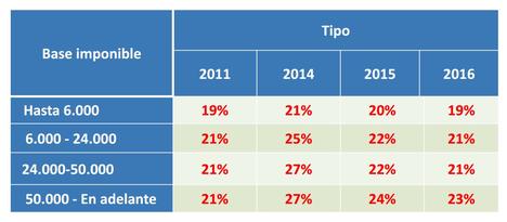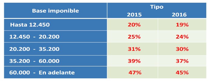 - IRPF, base general: los tipos bajarán a lo largo de los dos próximos ejercicios. La reducción se aplicará en dos pasos: el primero entrará en vigor en enero de 2015 y el segundo en enero de 2016. Montoro ha asegurado que la reducción será tal que supondrá revertir por completo e incluso ir más allá de lo aprobado en diciembre de 2011. El ministro ha hablado de una "rebaja media del 12,5% para todos los contribuyentes", que llegará al 23,5% para las rentas inferiores a los 24.000 euros.