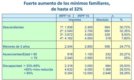 - La ayuda de 1.200 euros: el cambio en el IRPF incluirá la extensión de las ayudas que hasta ahora disfrutaban las madres trabajadoras con hijos menores de 3 años. Son 1.200 euros anuales que ahora irán destinados a las familias numerosas o con hijos o ascendientes con discapacidad. Montoro lo ha vendido si fuera un impuesto negativo sobre la renta; en realidad se trata de una ayuda directa de 100 euros al mes para estos contribuyentes, que podrán recibirla mes a mes o como deducción de un sólo golpe en la próxima declaración de la renta.