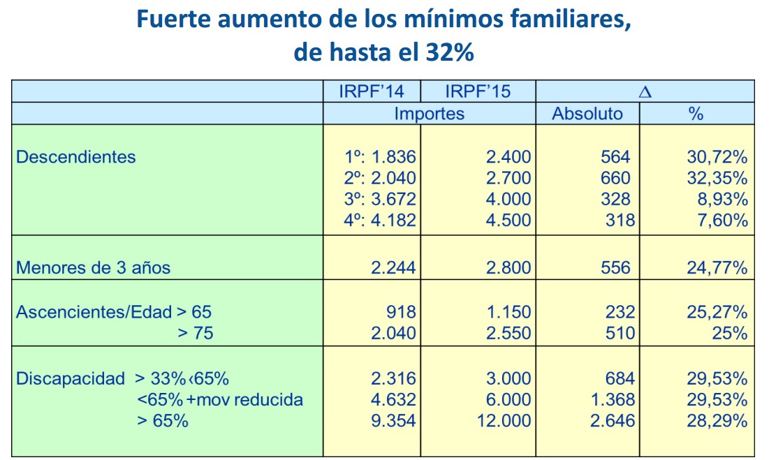 Aquí pueden verse dos de los cuadros presentados este viernes por Montoro. Arriba, las cuentas de Hacienda sobre el ahorro que tendrán las rentas del trabajo en función de las ganancias de cada contribuyente. En el de abajo, los cambios en los mínimos familiares (falta por saber si hay cambios en el mínimo exento general y en la reducción por rendimiento neto del trabajo):