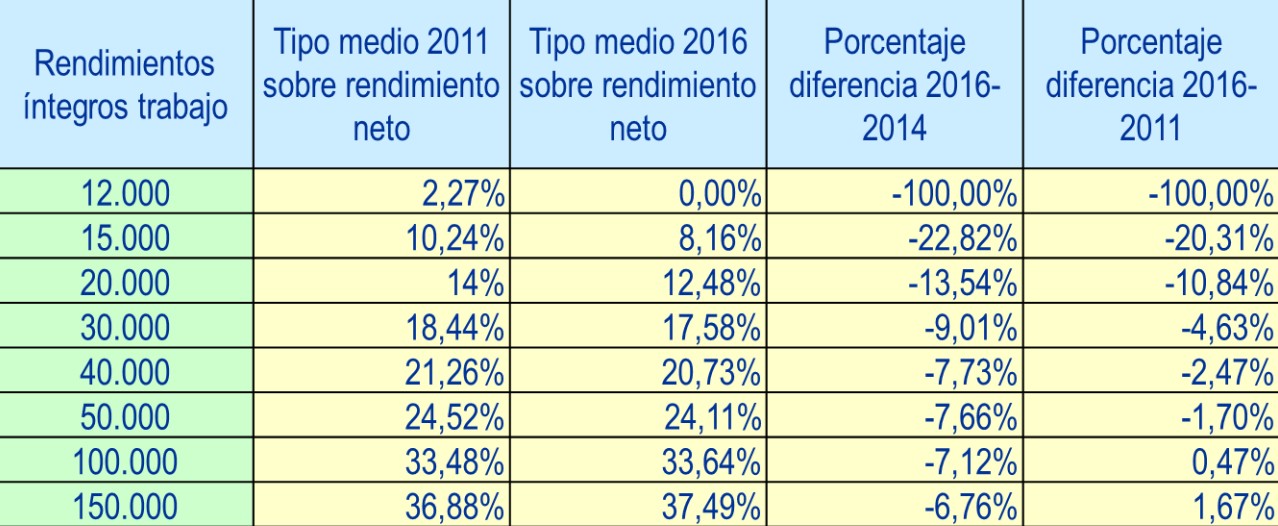 En esta cuestión, hay que destacar un aspecto que podría parecer anecdótico, pero es muy significativo. Según las cuentas de Hacienda, todos los contribuyentes pagarán menos IRPF en 2016 que en 2011 por los rendimientos del trabajo, excepto aquellos que cobren más de 100.000 euros. El Gobierno ha querido dejar una mínima subida para estos asalariados de alto nivel (de entre el 0,5 y el 1,5% de media), quizás para poder vender el mensaje de que sí sube impuestos a los ricos.