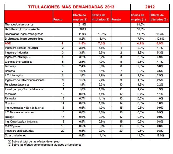 Respecto a las carreras más demandadas, Administración y Dirección de Empresas (ADE) vuelve a ser la líder con el 4,5% de las ofertas de empleo, lo que supone un aumento de tres décimas con respecto al año anterior. Tras ella, y escalando desde la cuarta posición, se sitúa Ingeniería Técnica Industrial. Así, del total de las ofertas analizadas, un 3,5% correspondió a estos ingenieros.