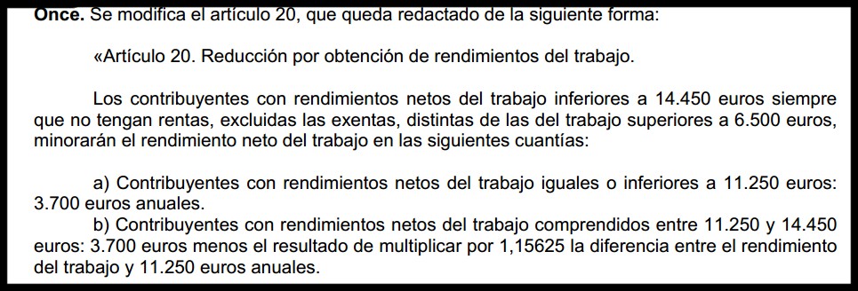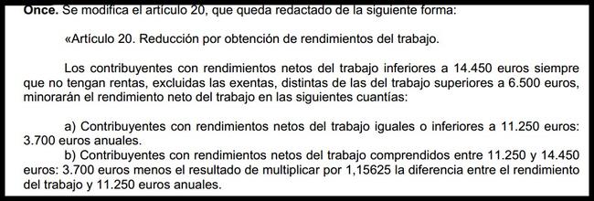 A cambio, se reduce la reducción propiamente dicha: para los ingresos netos inferiores a 11.250 euros será de 3.700 euros (más los 2.000 deducibles) y se irá reduciendo hasta que, al llegar a los 14.250 euros queda reducida a cero.