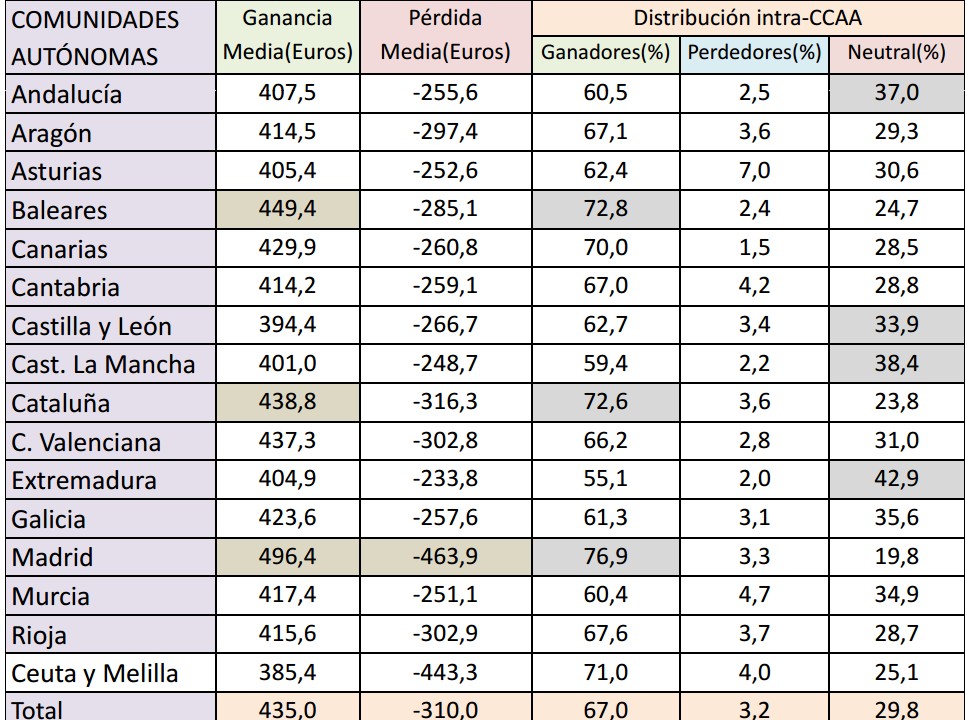 El informe también ha hecho referencia a cuánto ganarán perderán los contribuyentes dependiendo de la comunidad autónoma donde vivan. Así, manteniendo los diferentes tramos autonómicos como hasta ahora y los niveles de renta per cápita, las regiones con mayor porcentaje de ganadores serán Madrid (76,9%), Baleares (72,8%) y Cataluña (72,6%). Por el contrario, las comunidades con más contribuyentes perjudicados son Asturias (7%), Murcia (4,7%) y Cantabria (4,2%). En todos los casos podemos ver que los porcentajes son muy reducidos.