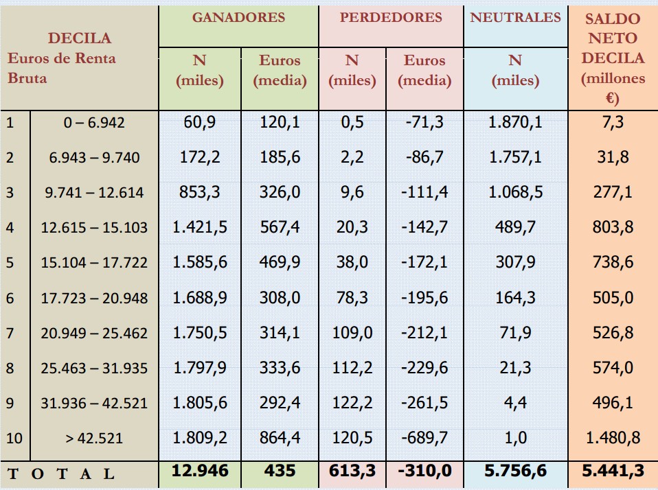 Respecto a los perdedores, va aumentando su número junto con sus ingresos. Son pocos en cualquier caso. Pero en los cuatro deciles superiores (del 7 al 10) tenemos a más de 100.000 contribuyentes que estarán peor que este año. La razón probablemente haya que buscarla en las medidas que no afectan directamente a las rentas salariales. La eliminación de las ventajas a los dividendos o al alquiler provocará que haya declarantes que estén peor, a pesar de las reducciones en los tramos.
