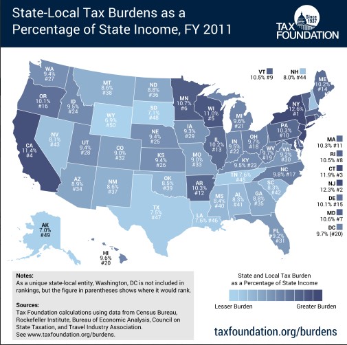 Hasta ahora hemos repasado la incidencia efectiva de los gravámenes vigentes a nivel federal. A estos impuestos nacionales se unen los diferentes recargos que introducen los gobiernos estatales y las Administraciones locales. Para determinar qué áreas del país norteamericano mantienen una presión fiscal más alta o más baja, podemos fijarnos en el mapa siguiente.