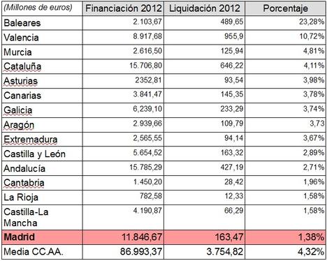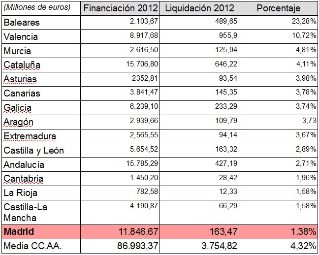 En la comparación de los datos de liquidación del Sistema de Financiación Autonómica de 2012 y los del primer ejercicio en el que se aplicó la nueva Ley de Financiación Autonómica (2009) destaca que en términos absolutos, la comunidad autónoma que ha tenido una peor evolución ha sido la Comunidad de Madrid. En esta región, la finaciación ha crecido en sólo un 2,32% hasta los 269 millones de euros. En el caso de Cataluña ha crecido en un 5,37% hasta los 800 millones. En la parte alta de la tabla se encuentran comunidades como La Rioja, donde crece un 19,26%. En el caso de Andalucía el crecimiento es del 13,05% hasta los 1.821,91 millones de euros.