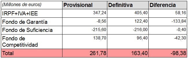En la liquidación de 2012 -datos que se conocen ahora- Hacienda compensará con 163,4 millones a la Comunidad de Madrid, cuando en los cálculos provisionales había estimado 261,7 millones de euros. Es decir, que recibe casi 100 millones de euros (98,38) menos, convirtiéndose en la región con menor liquidación de todas (1,38% del total de su financiación).