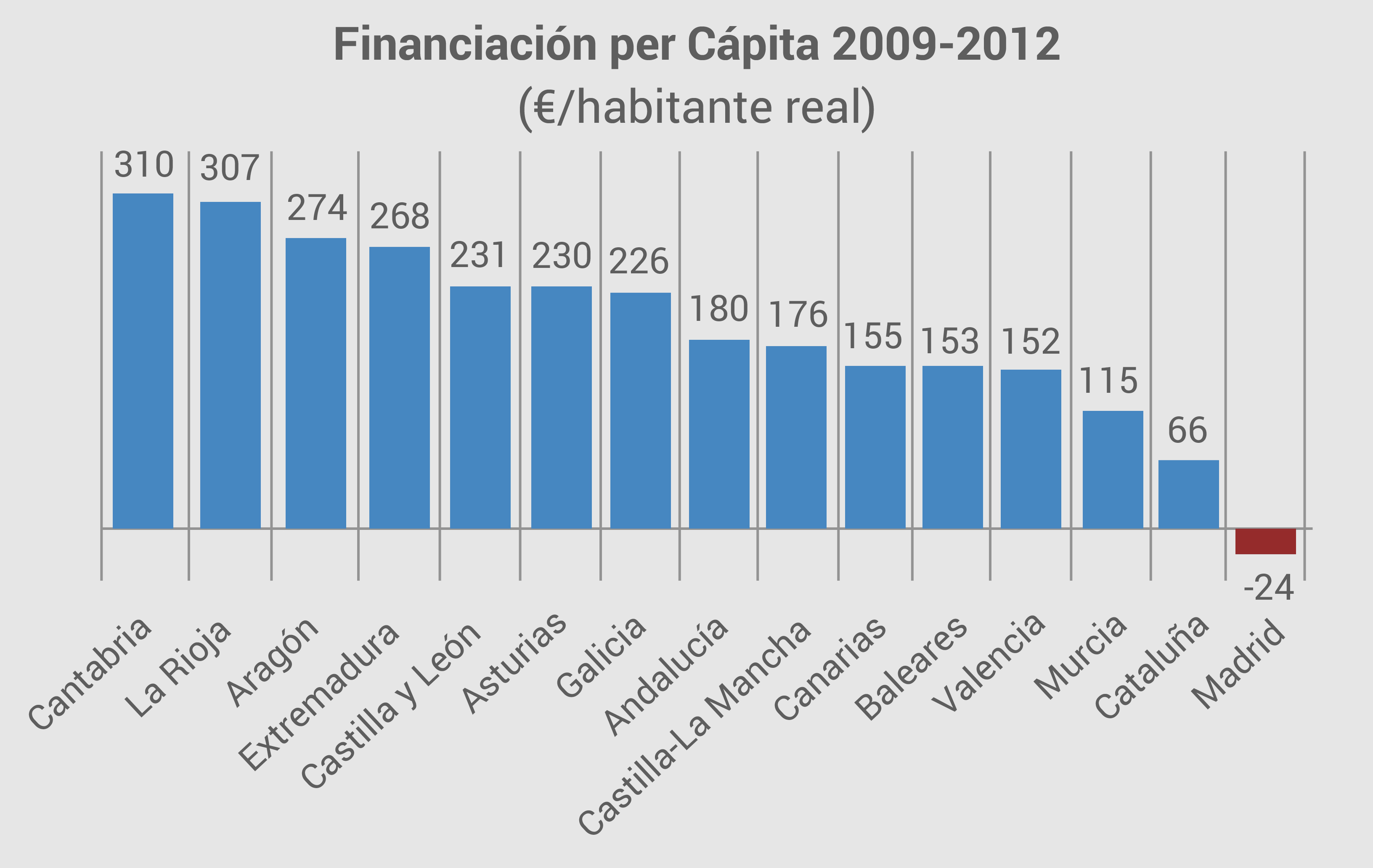Si nos fijamos únicamente en el periodo comprendido entre la puesta en marcha del nuevo sistema de financiación autonómica en 2009 y la última liquidación (2012), la Comunidad de Madrid se convierte en la única Comunidad Autónoma que pierde financiación per cápita por habitante real. Así, mientras Cantabria o La Rioja incrementan en 300 euros su financiación por habitante, Madrid pierde 24. De hacer la comparativa con 2014, la pérdida se multiplica hasta los 83 euros.