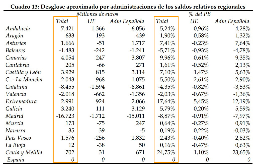 Otra conclusión diferente que se puede extraer de este análisis es la comparativa de las cuentas autonómicas en relación a su PIB. De nuevo, Madrid vuelve a ser la región perdedora, con un resultado negativo del 8,87% del PIB, seguida de Baleares, con 5,71%, y de Cataluña, con el 4,35%.