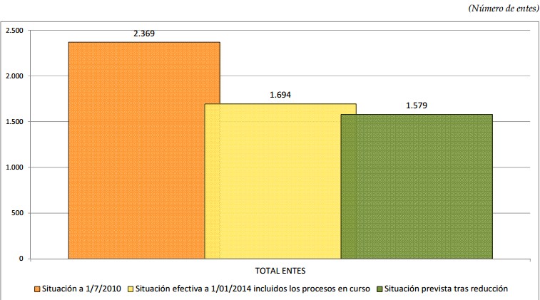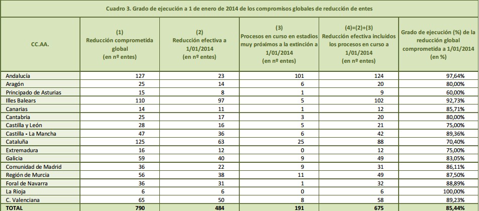 El anterior Gobierno socialista de José Luis Rodríguez Zapatero y las autonomías acordaron suprimir algo más de 500 entidades antes de 2013 respecto al número de entes existente a fecha de 1 de julio de 2010. Posteriormente, con el PP ya en el poder, ese compromiso inicial se amplió a un total de 790 órganos. De este modo, con la anunciada eliminación de 675 entes, las CCAA ya habrían ejecutado el 85% del plan de reordenación.