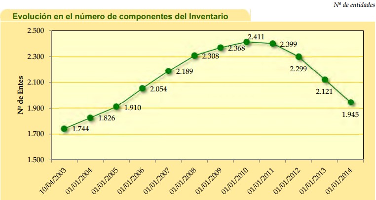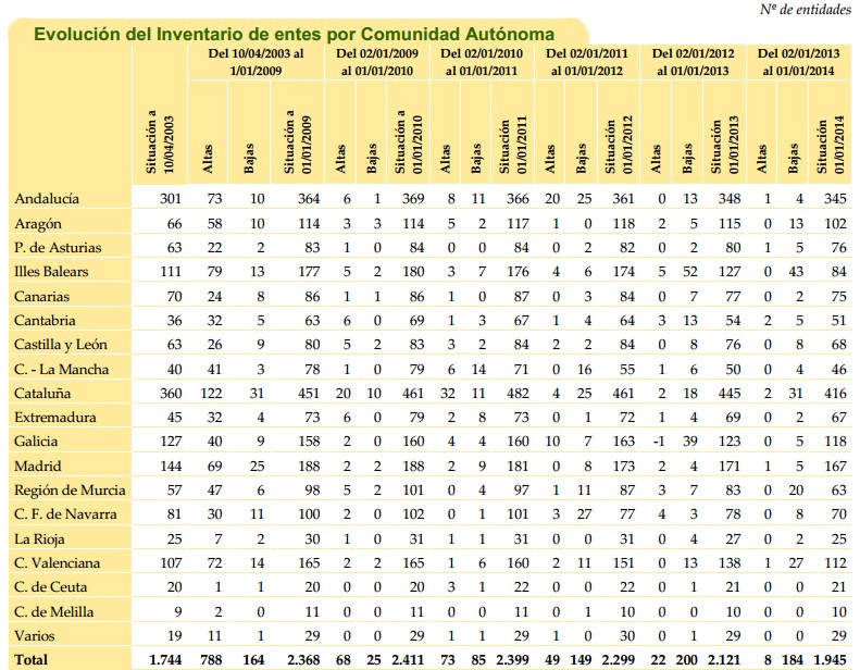 Así, el inventario oficial de entes autonómicos contabiliza un total de 1.945 entidades a fecha 1 de enero de 2014, lo cual implica 169 menos que un año antes (-8,3%) y la supresión de 486 desde julio de 2010, equivalente a una reducción de casi el 20%.