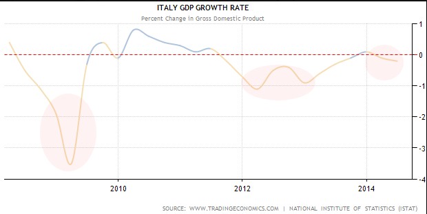 El PIB de Italia bajó un 0,2% en el segundo trimestre de 2014, con lo que el país entró de nuevo en recesión técnica. El mínimo repunte experimentado a finales de 2013, con un avance del 0,1%, fue un mero espejismo, tras acumular 18 meses sin registrar tasas positivas.
