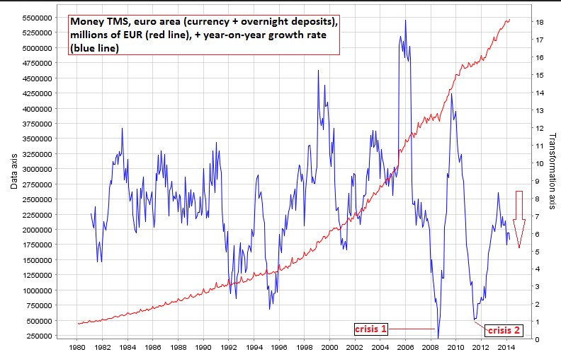 Como consecuencia, la oferta monetaria en la zona euro sigue desacelerándose. Su volumen total ha aumentado debido a las inyecciones masivas puestas en marcha por el BCE durante la crisis, pero su tasa de crecimiento interanual ha bajado de forma pronunciada en los últimos tiempos, acentuando el riesgo de la temida deflación. Esto demuestra, una vez más, el rotundo fracaso que ha cosechado la autoridad monetaria a la hora de intentar reactivar el crédito. La delicada situación de la banca y la ausencia de demanda solvente explica dicha contracción crediticia.