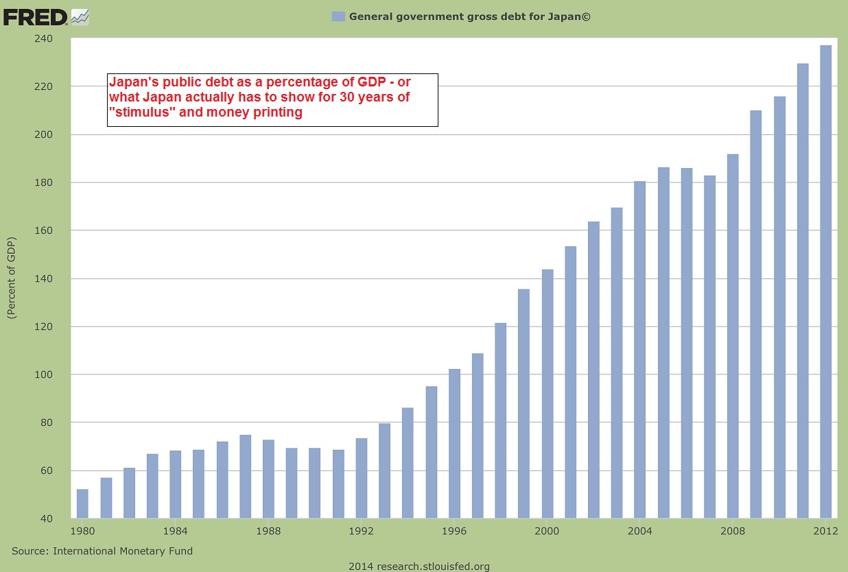 Veinticinco años de estancamiento económico y Japón insiste, una y otra vez, en los mismos errores. A saber, que una crisis de deuda y malas inversiones no se solventa con más deuda y peores inversiones. La economía nipona sufrió una enorme burbuja crediticia durante los años 80, pero cuando estalló su gobierno optó por la vía keynesiana para tratar de impulsar la recuperación, disparando el gasto público y optando por la devaluación monetaria en lugar de corregir sus graves desequilibrios estructurales.