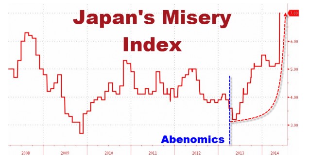 Por otro lado, la devaluación del yen se ha traducido en un fuerte encarecimiento de las importaciones y, por tanto, en una subida de precios que, con los salarios estancados, está mermando la capacidad adquisitiva de los japoneses (empobrecimiento). Como consecuencia, el denominado Índice de Miseria, que combina tasa de paro (3,6%) e inflación (3,4%), se ha situado en el nivel más alto desde 1981, con un inédito 7%.